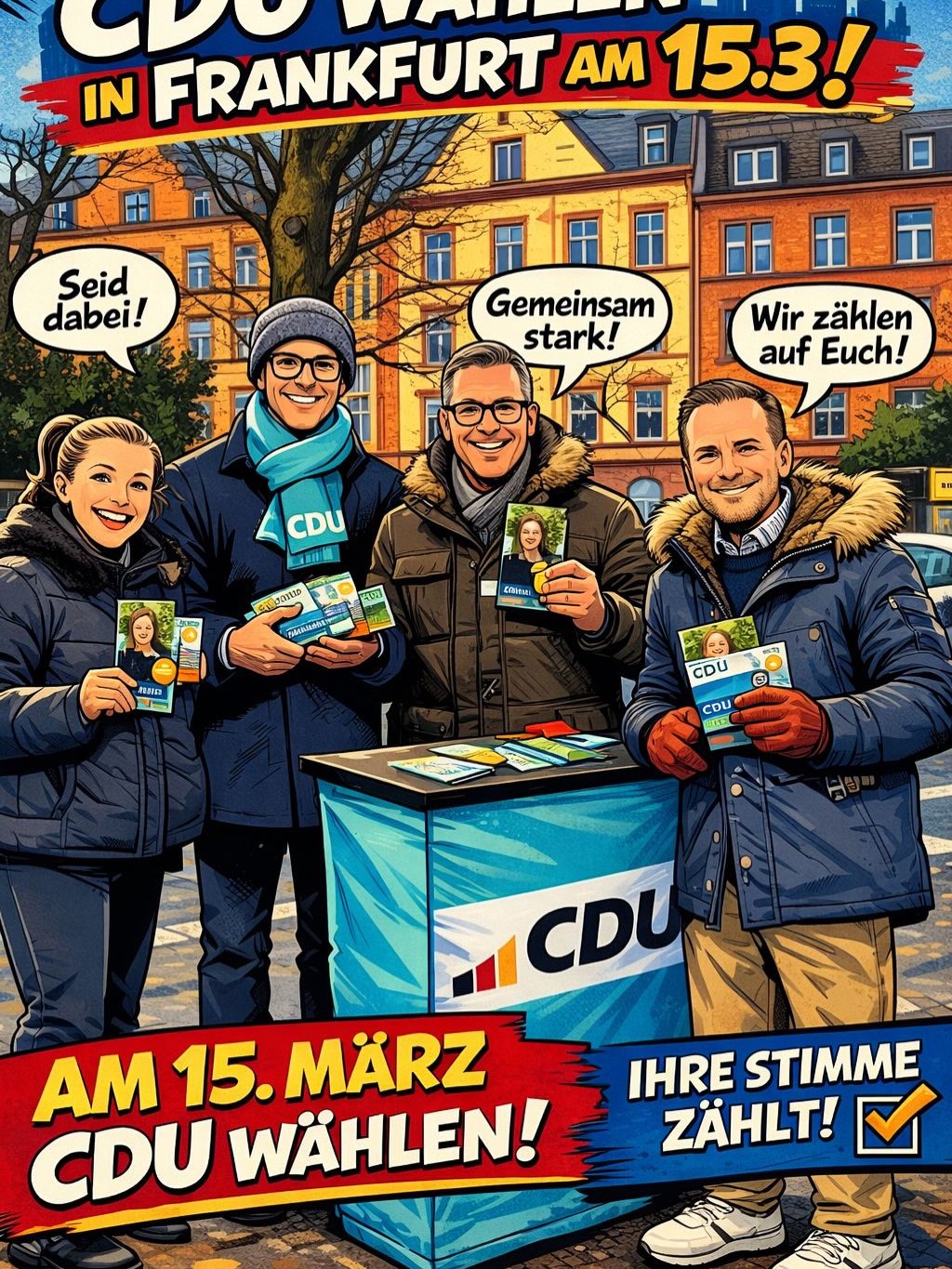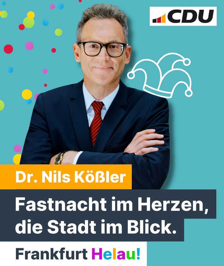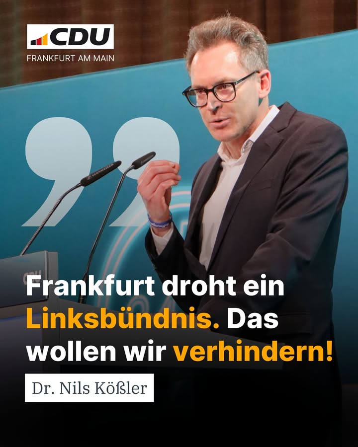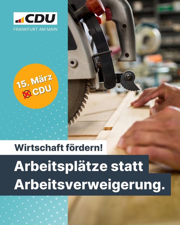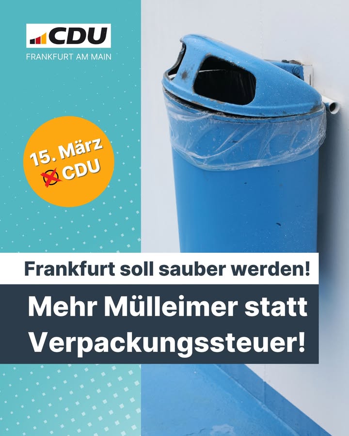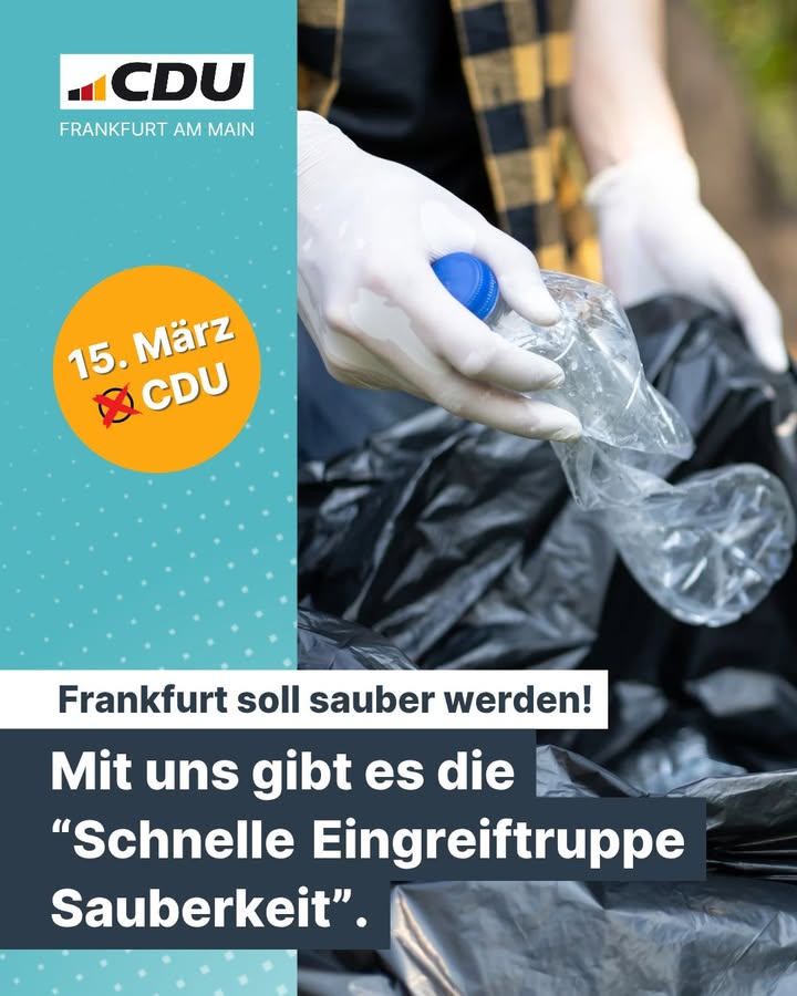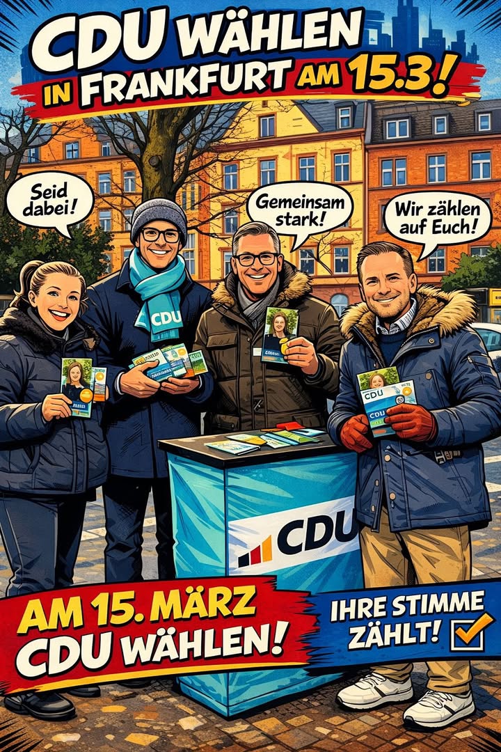 2026 muss das Jahr des Politikwechsels für Frankfurt werden! Als CDU wollen wir, dass unsere Stadt sicher, sauber und wieder lebenswerter wird – auf den Straßen und Plätzen, in Parks, in Bussen und Bahnen. Frankfurt muss funktionieren: im Straßenverkehr, mit guten Schulen und einer Wohnungspolitik, die alle Menschen im Blick hat. Am 15. März 2026 entscheiden Sie über die Zukunft unserer Stadt. Die CDU steht für eine verlässliche, bürgernahe Politik mit klaren Prioritäten und einen echten Politikwechsel statt Symbolpolitik.